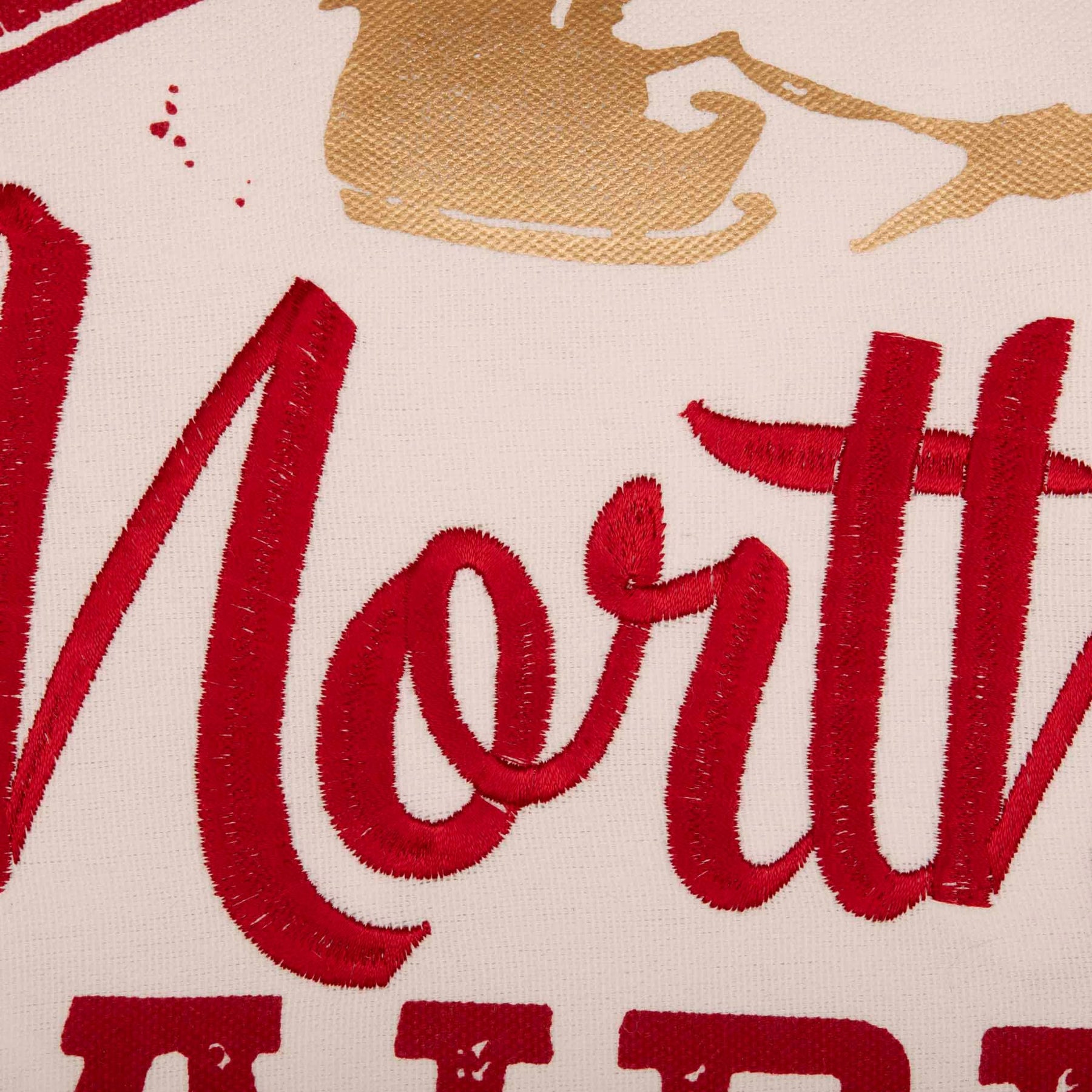 Bring a pop of color to your Christmas decor with the North Pole Airmail Pillow. This whimsical holiday pillow has the words "North Pole", "Airmail" and "Express Service" in cherry red with a gold appliqued silhouette of Santa's sleigh and reindeer above the cursive "North Pole".